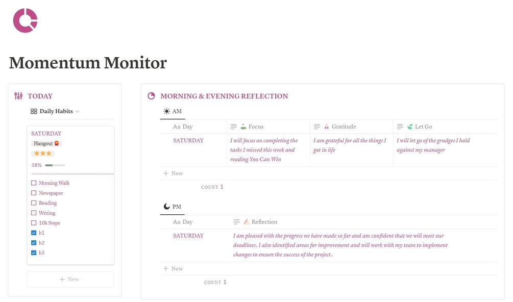 The Momentum Monitor Notion template provides everything needed to stay focused and achieve goals